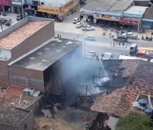 As imagens aéreas mostram o estrago provocado pelo fogo, que atingiu parte das instalações e materiais do local. Equipes de socorro foram acionadas para conter as chamas e evitar que o incêndio se espalhasse.